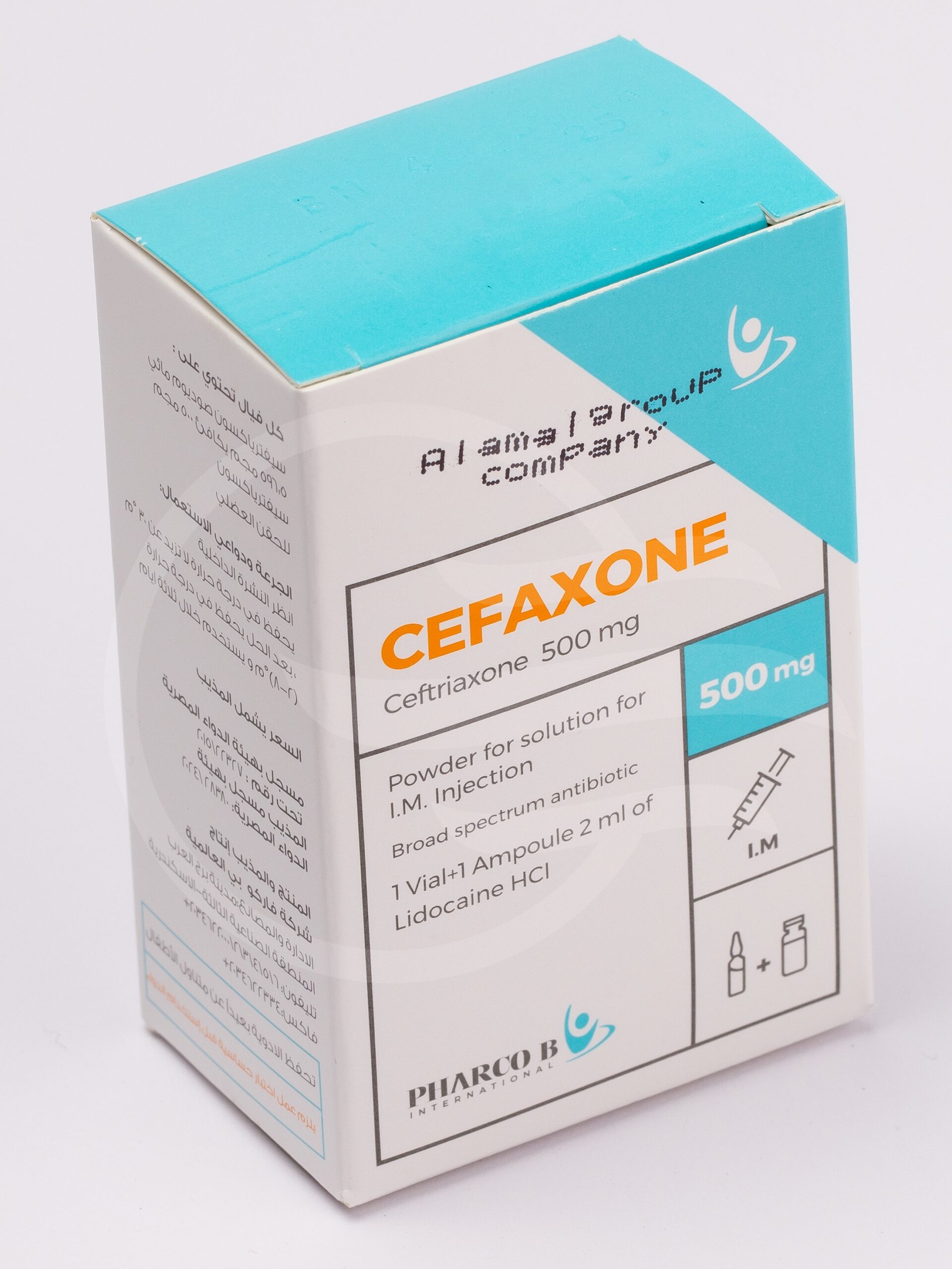 Ceftriaxone, 500 mg, I.M, 1 Vial + I ampoule 2ml of Lidocaine HCL, Pharco B International.